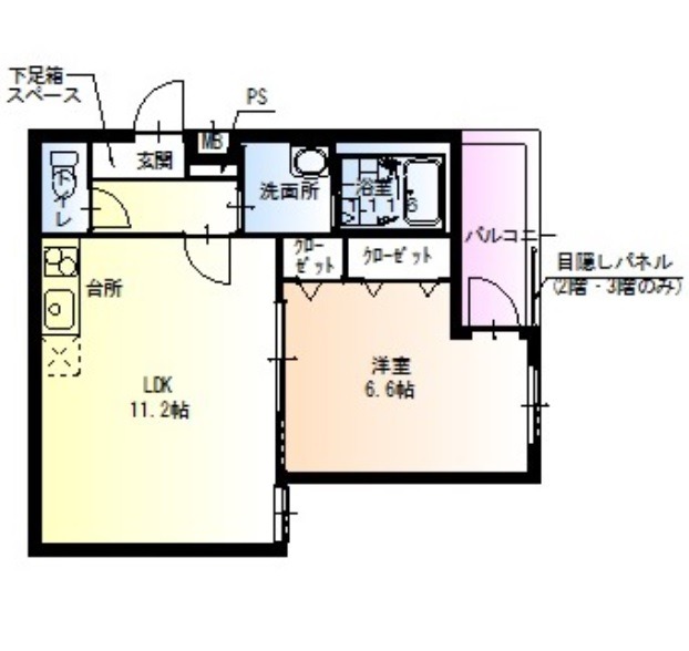 | 間取り詳細 | LDK 11.2畳 、 洋室 6.6畳 |