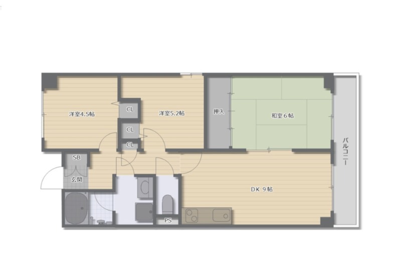 | 間取り詳細 | DK 9畳 、 和室 6畳 、 洋室 5.2畳 、 洋室 4.5畳 |