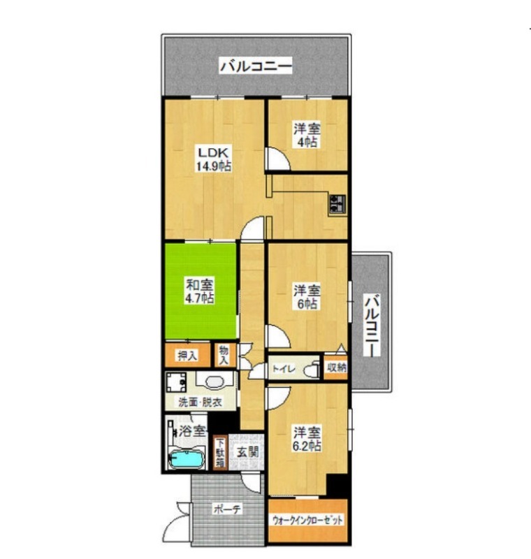 | 間取り詳細 | LDK 14.9畳 、 洋室 6.2畳 、 洋室 6畳 、 洋室 4畳 、 和室 4.7畳 |
