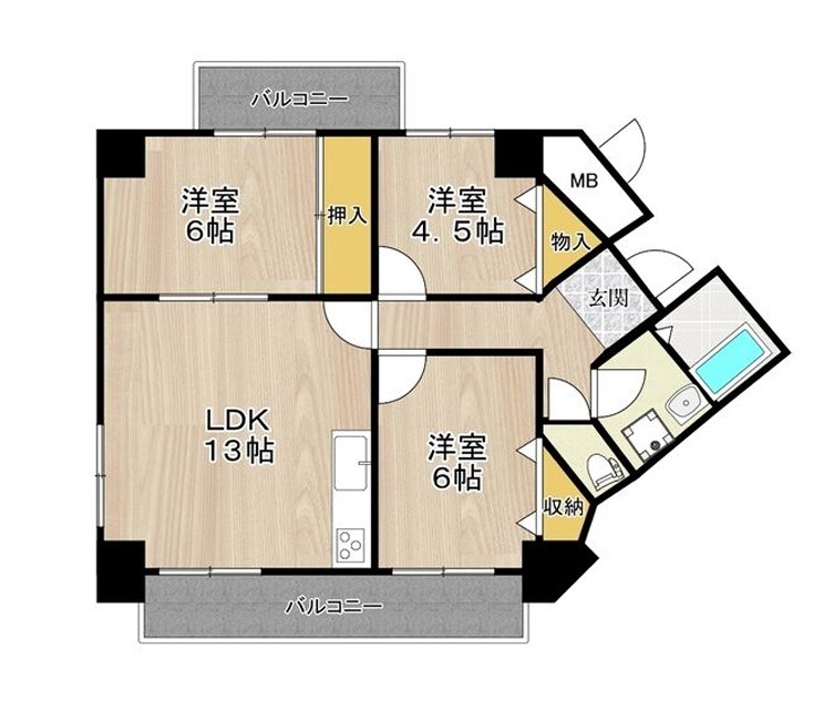 | 間取り詳細 | LDK 13畳 、 洋室 6畳 、 洋室 4.5畳 、 和室 6畳 |