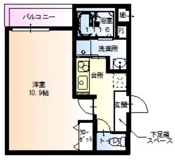 | 間取り詳細 | K 2.5畳 、 洋室 10.9畳 |