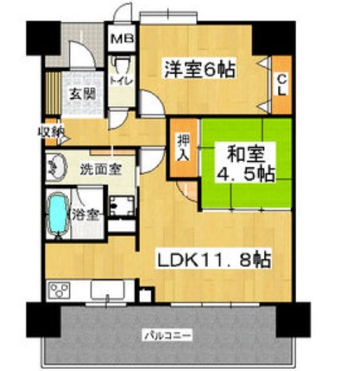 | 間取り詳細 | LDK 11.8畳 、 洋室 6畳 、 和室 4.5畳 |