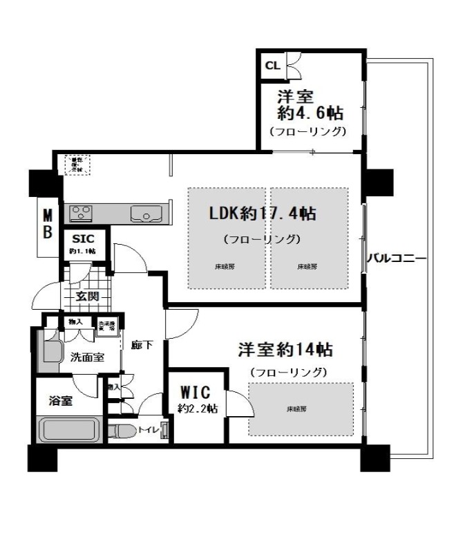 | 間取り詳細 | LDK 17.4畳 、 洋室 14畳 、 洋室 4.6畳 |