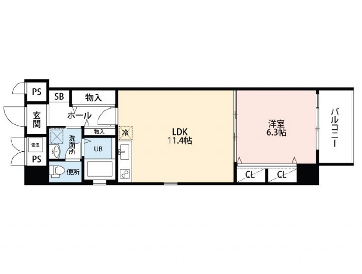 | 間取り詳細 | LDK 11.4畳 、 洋室 6.3畳 |