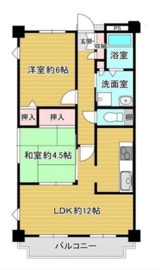 | 間取り詳細 | LDK 12畳 、 洋室 6畳 、 和室 4.5畳 |