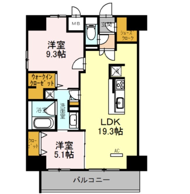 | 間取り詳細 | LDK 19.3畳 、 洋室 9.3畳 、 洋室 5.1畳 |