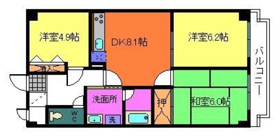 | 間取り詳細 | DK 8.1畳 、 洋室 6.2畳 、 和室 6畳 、 洋室 4.9畳 |