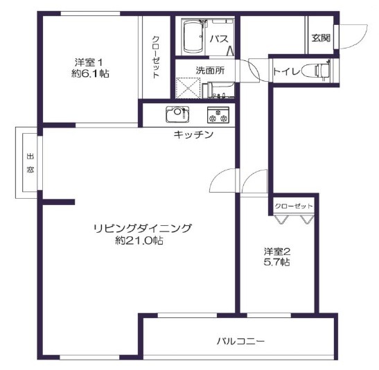 | 間取り詳細 | LDK 21畳 、 洋室 5.7畳 、 洋室 6.1畳 |