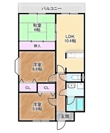 | 間取り詳細 | LDK 10.4畳 、 洋室 6.8畳 、 洋室 5.9畳 、 和室 6畳 |