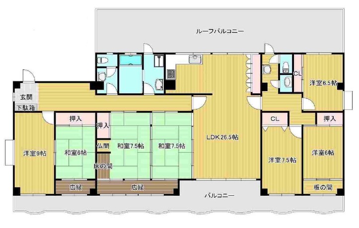 | 間取り詳細 | LDK 26.5畳 、 洋室 6.5畳 、 洋室 6畳 、 洋室 7.5畳 、 洋室 9畳 、 和室 7.5畳 、 和室 7.5畳 |