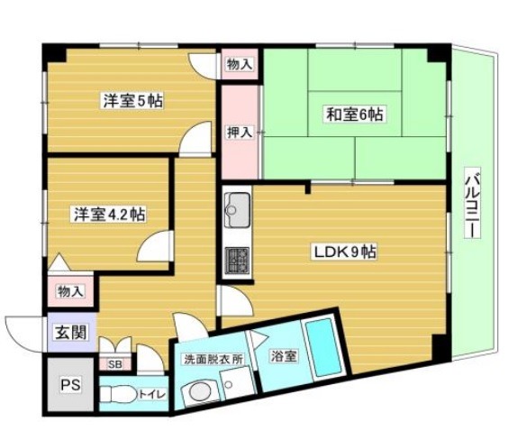 | 間取り詳細 | LDK 9畳 、 洋室 5畳 、 洋室 4.2畳 、 和室 6畳 |