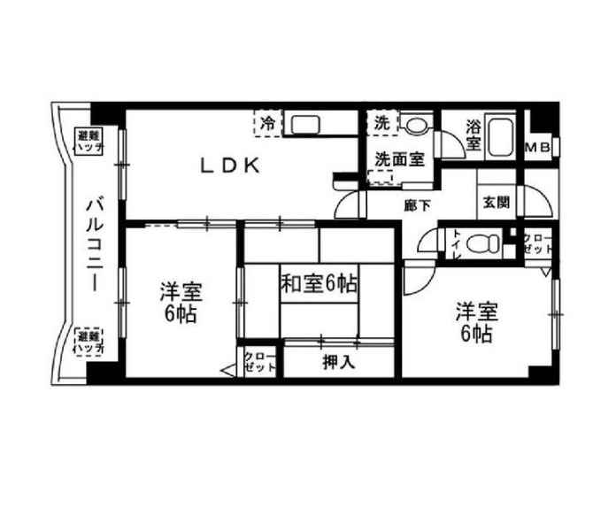 | 間取り詳細 | LDK 畳 、 洋室 6畳 、 洋室 6畳 、 和室 6畳 |