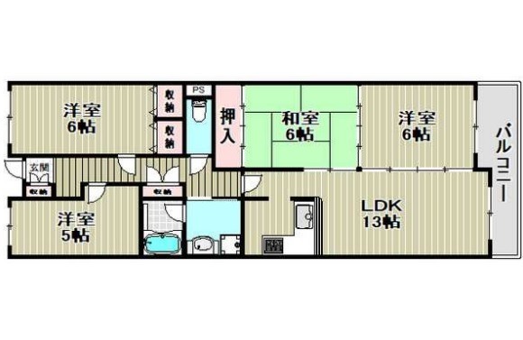 | 間取り詳細 | LDK 13畳 、 洋室 6畳 、 洋室 6畳 、 洋室 5畳 、 和室 6畳 |