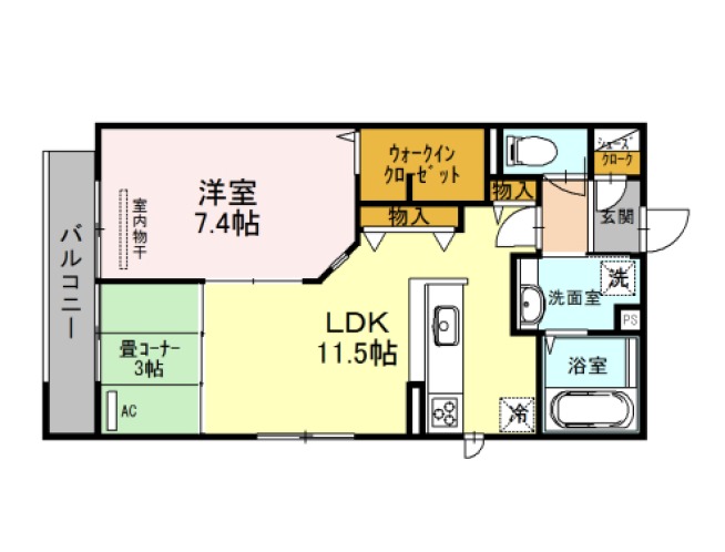 | 間取り詳細 | LDK 11.5畳 、 洋室 7.4畳 、 和室 3畳 |
