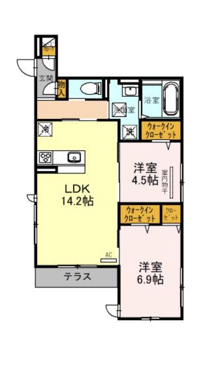 | 間取り詳細 | LDK 14.2畳 、 洋室 6.9畳 、 洋室 4.5畳 |