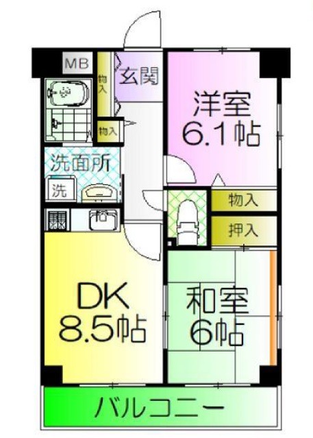 | 間取り詳細 | DK 8.5畳 、 洋室 6.1畳 、 和室 6畳 |