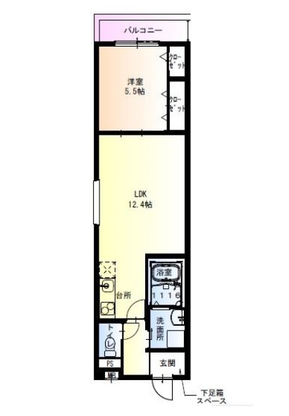 | 間取り詳細 | LDK 12.4畳 、 洋室 5.5畳 |