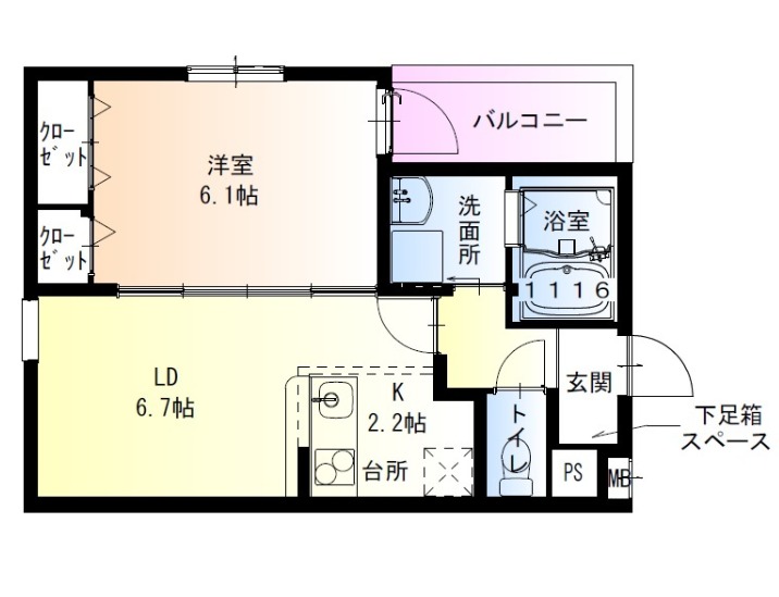 | 間取り詳細 | LDK 6.7畳 、 洋室 6.1畳 |