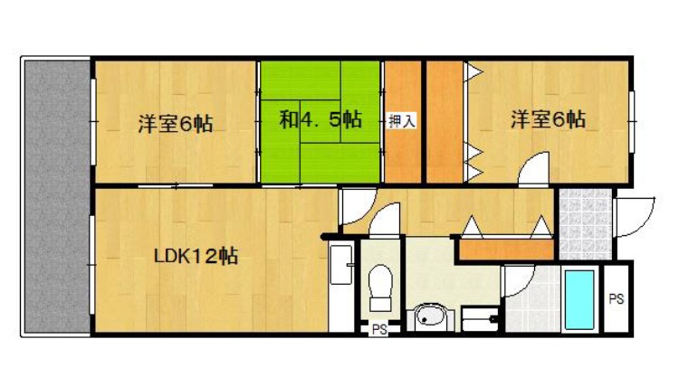 | 間取り詳細 | LDK 12畳 、 洋室 6畳 、 洋室 6畳 、 和室 4.5畳 |