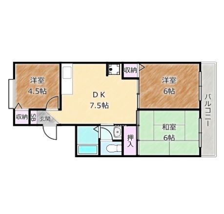 | 間取り詳細 | DK 7.5畳 、 洋室 6畳 、 洋室 6畳 、 和室 4.5畳 |