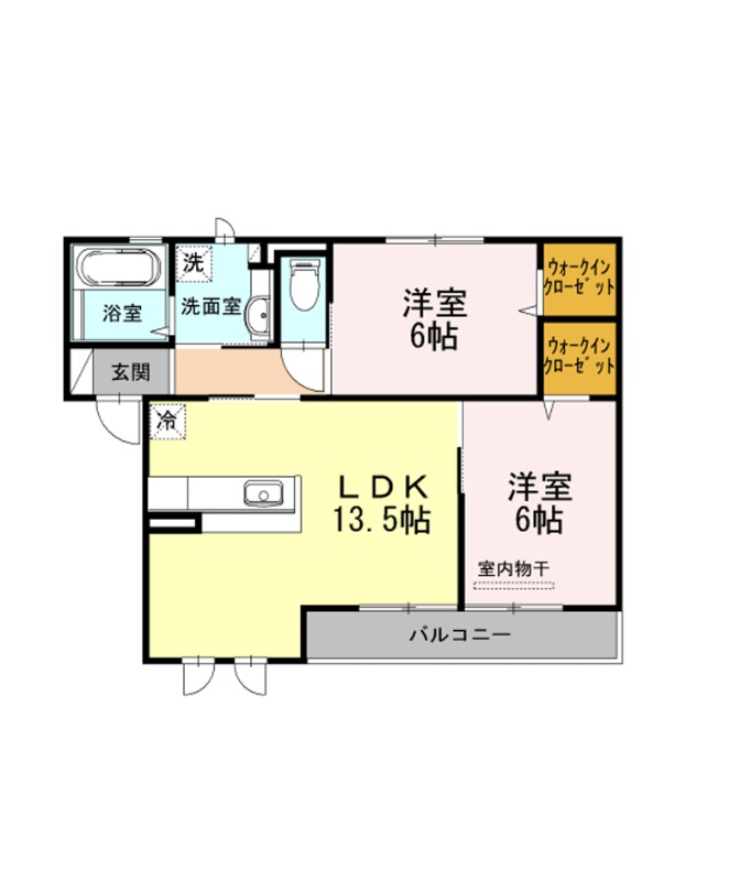 | 間取り詳細 | LDK 13.5畳 、 洋室 6畳 、 洋室 6畳 |