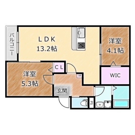 | 間取り詳細 | LDK 13.2畳 、 洋室 5.3畳 、 洋室 4.1畳 |