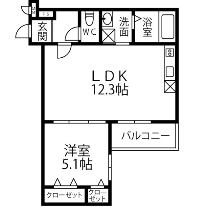 | 間取り詳細 | LDK 12.3畳 、 洋室 5.1畳 |