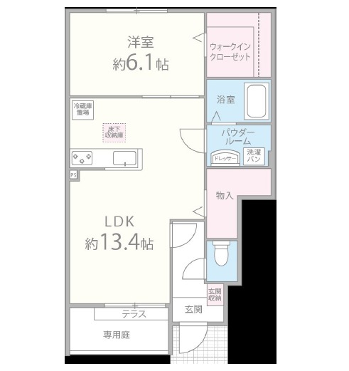 | 間取り詳細 | LDK 13.4畳 、 洋室 6.1畳 |