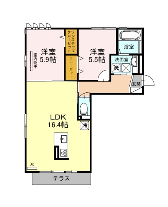 | 間取り詳細 | LDK 16.4畳 、 洋室 5.9畳 、 洋室 5.5畳 |