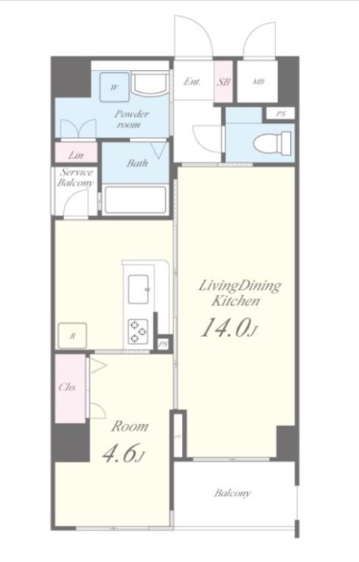 | 間取り詳細 | LDK 14畳 、 洋室 4.6畳 |
