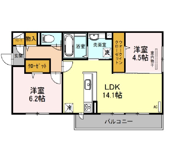 | 間取り詳細 | LDK 14.1畳 、 洋室 6.2畳 、 洋室 4.5畳 |