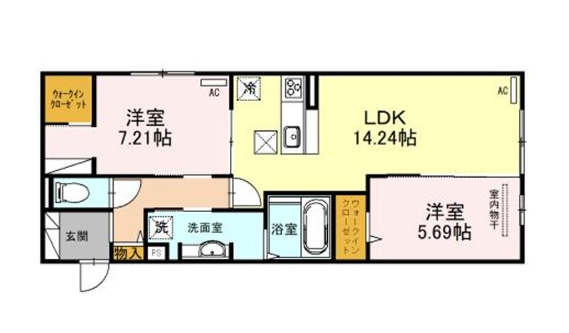 | 間取り詳細 | LDK 14.24畳 、 洋室 5.69畳 、 洋室 7.21畳 |