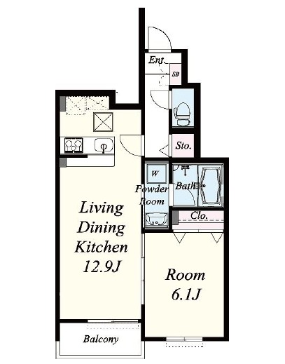 | 間取り詳細 | LDK 12.9畳 、 洋室 6.1畳 |