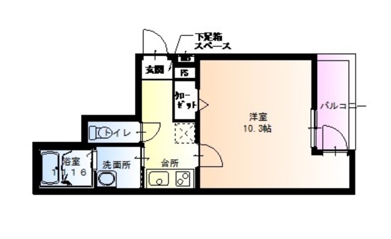 | 間取り詳細 | K 2.5畳 、 洋室 10.3畳 |