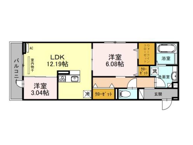 | 間取り詳細 | LDK 12.19畳 、 洋室 6.08畳 、 洋室 3.04畳 |