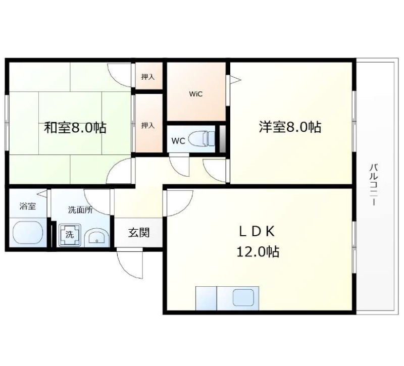 | 間取り詳細 | LDK 12畳 、 洋室 8畳 、 和室 8畳 |