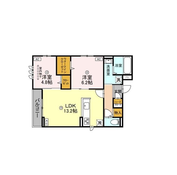 | 間取り詳細 | LDK 13.2畳 、 洋室 6.2畳 、 洋室 4.8畳 |
