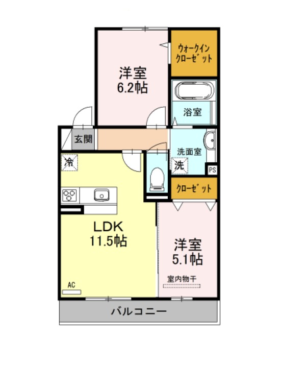| 間取り詳細 | LDK 11.5畳 、 洋室 5.1畳 、 洋室 6.2畳 |