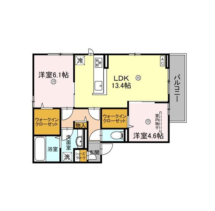 | 間取り詳細 | LDK 13.4畳 、 洋室 6.1畳 、 洋室 4.6畳 |