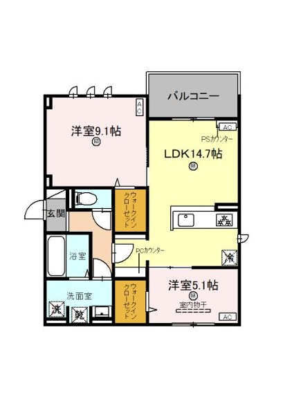 | 間取り詳細 | LDK 14.7畳 、 洋室 9.1畳 、 洋室 5.1畳 |