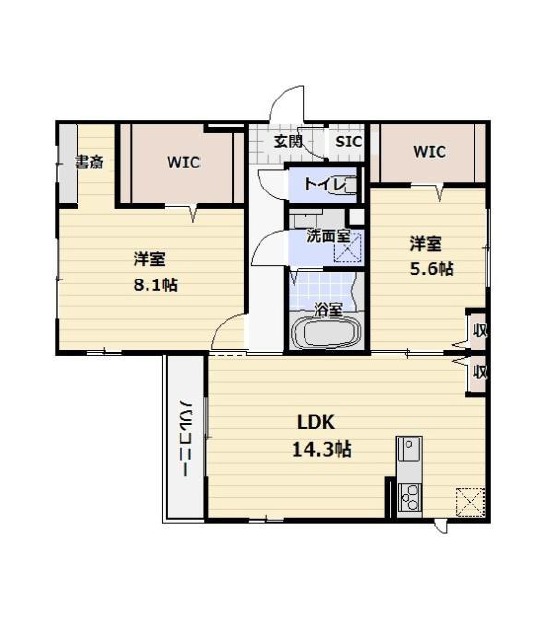 | 間取り詳細 | LDK 14.3畳 、 洋室 8.1畳 、 洋室 5.6畳 |