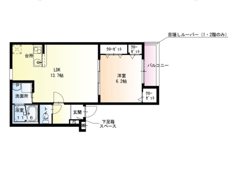 | 間取り詳細 | LDK 13.7畳 、 洋室 6.2畳 |