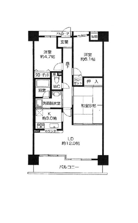 | 間取り詳細 | LDK 15畳 、 洋室 6.1畳 、 洋室 4.7畳 、 和室 6畳 |