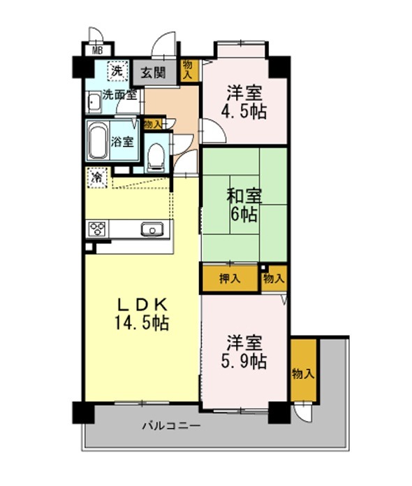 | 間取り詳細 | LDK 14畳 、 洋室 5.9畳 、 洋室 5.2畳 、 和室 6畳 |