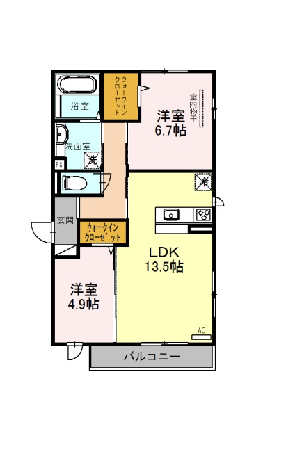 | 間取り詳細 | LDK 13.5畳 、 洋室 6.7畳 、 洋室 4.9畳 |