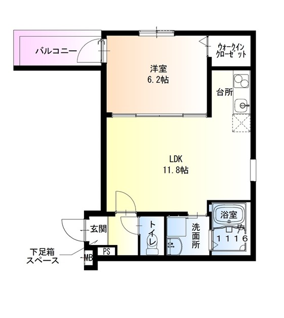 | 間取り詳細 | LDK 11.8畳 、 洋室 6.2畳 |