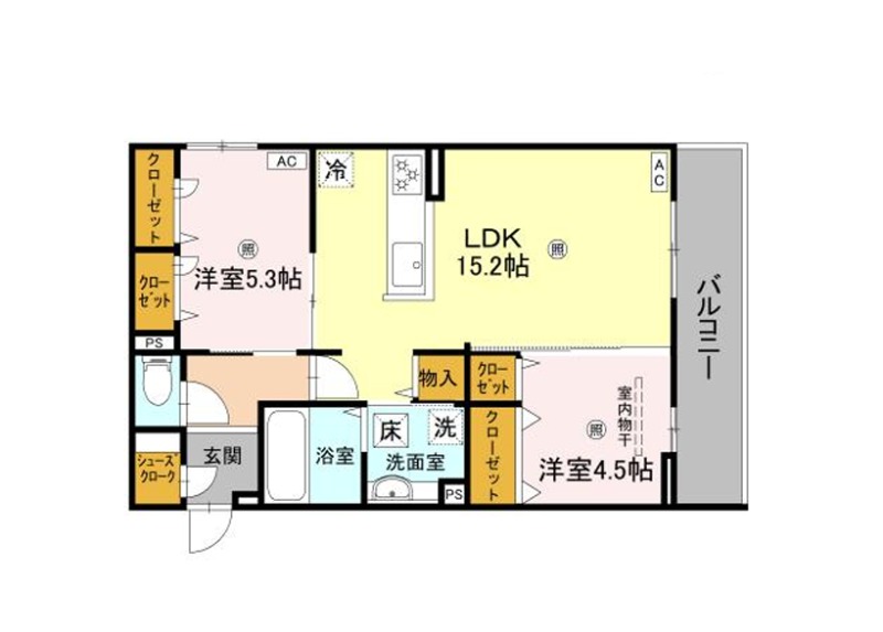 | 間取り詳細 | LDK 15.2畳 、 洋室 5.3畳 、 洋室 4.5畳 |