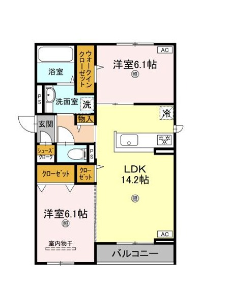 | 間取り詳細 | LDK 14.2畳 、 洋室 6.1畳 、 洋室 6.1畳 |