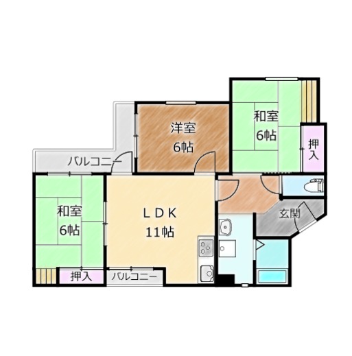 | 間取り詳細 | LDK 11畳 、 洋室 6畳 、 和室 6畳 、 和室 6畳 |