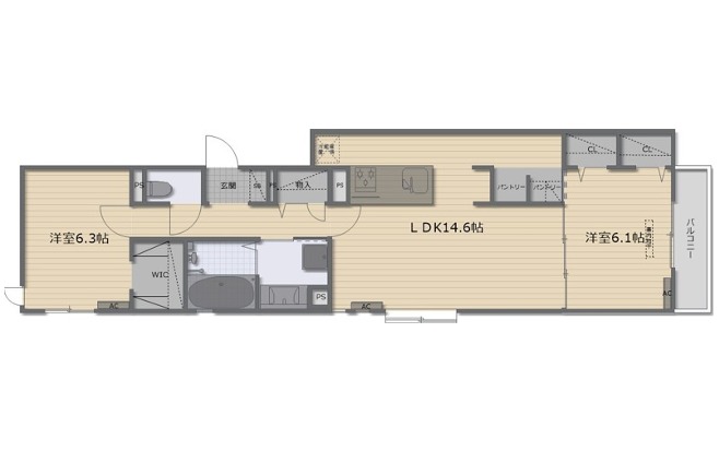 | 間取り詳細 | LDK 14.6畳 、 洋室 6.3畳 、 洋室 6.1畳 |